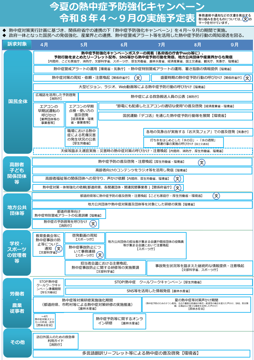 | 7月 | 梅雨明けに特に熱中症のリスクが高いことを国民へ注意喚起 |